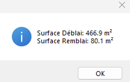 La commande Surface remblai et déblai permet de visualiser rapidement les zones en déblais et en remblais entre deux MNT ou par rapport à une hauteur fixe. Le résultat est une nouvelle couche avec des points colorés et un résumé des surfaces calculées.