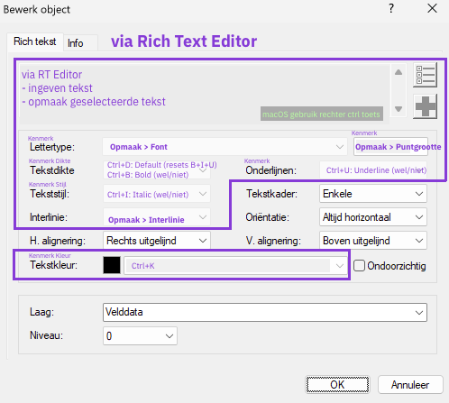 Alle tekens delen dezelfde opmaak: één vast lettertype en -grootte per object. | Meerdere lettertypes, groottes en stijlen binnen één object. Inhoud en opmaak via de ingebouwde Rich Text Editor. | |