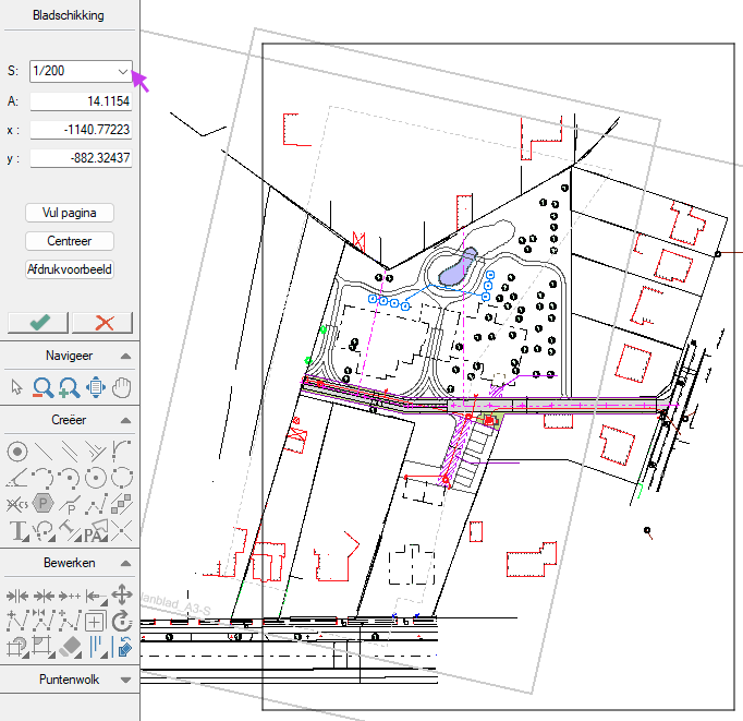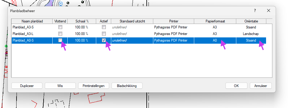 Wanneer je een tekening wil afdrukken of opslaan als PDF, werk je in Pythagoras altijd met een planblad.