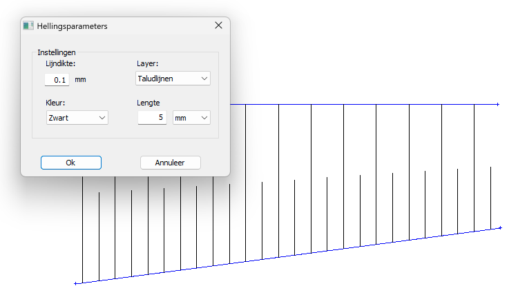 Lengte: bepaalt de onderlinge afstand tussen de taludlijnen, gemeten langs het talud.Klik op OK om de instellingen te bevestigen.